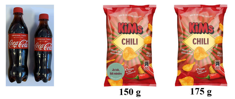 I undersøgelsen er deltagerne blevet præsenteret for billederne herunder inkl. tekst, der angiver de præcise størrelser. Colaerne er på henholdsvis 50 cl. og 37,5 cl. Poserne med chips indeholder henholdsvis 150 og 175 g chips. Posen med 150 g chips bærer et Ja tak, lidt mindre-logo.