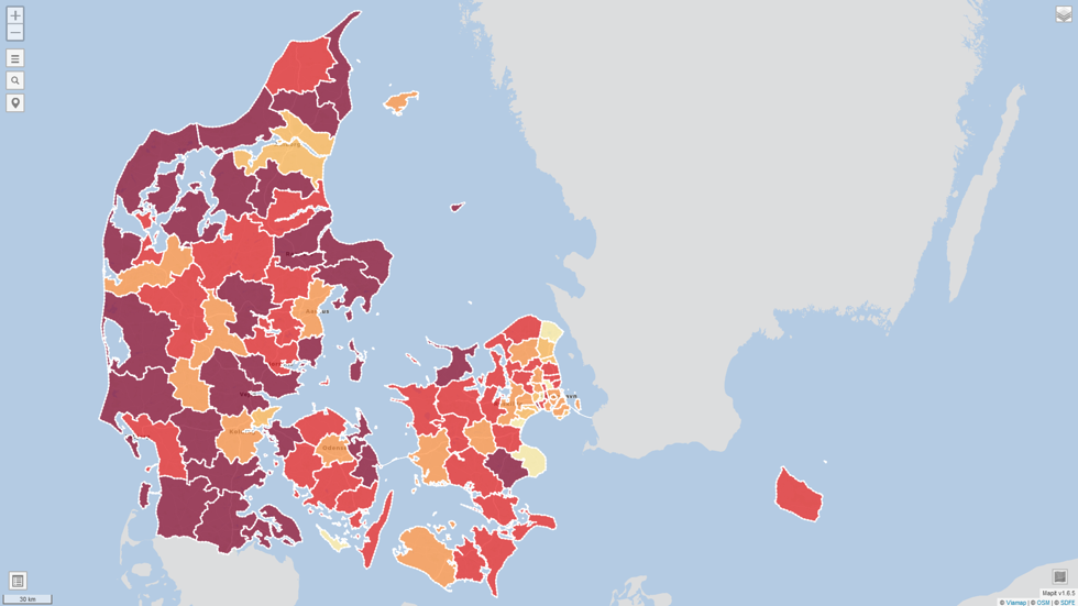 Billedet herunder viser, hvor stor en procentdel af danskernes måltider, der indeholder kål. Jo mørkere en kommune er, desto oftere spiser man kål dér. Overordnet spiser danskerne meget kål, men der er også geografisk forskel på, hvor ofte vi gør det. I de mørklilla kommuner - f.eks. Haderslev, Vejle og Odsherred - bliver der spist kål til aftensmad mindst én ud af ti aftener. Der, hvor man spiser mindst kål, sker det i gennemsnit hver 14. dag.