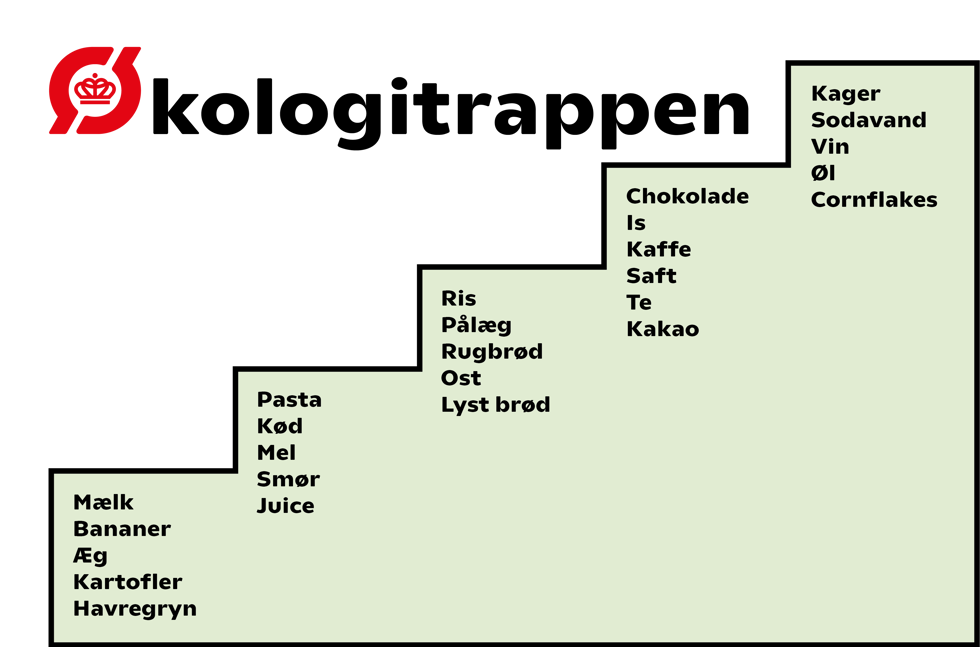 Den Økologiske trappe viser de forskellige trin på vej mod et større økologisk forbrug. Nederst på trappen finder vi mælk, som altså er den vare, de fleste begynder at købe i en økologisk version. Allerøverst på trappen finder vi cornflakes.