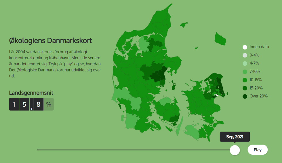 I 2021 landede den gennemsnitlige økoandel i Danmark på 16 procent. Det betyder, at for hver 100 varer, der blev købt i Coops butikker, var 16 af dem økologiske. Det er en markant stigning fra 2010, hvor økoandelen var på lidt over syv procent. Du kan se mere om, hvordan økologien har udviklet sig i Danmark fra 2004 og frem til slutningen af 2021 i Coops Økologiske Danmarkskort.